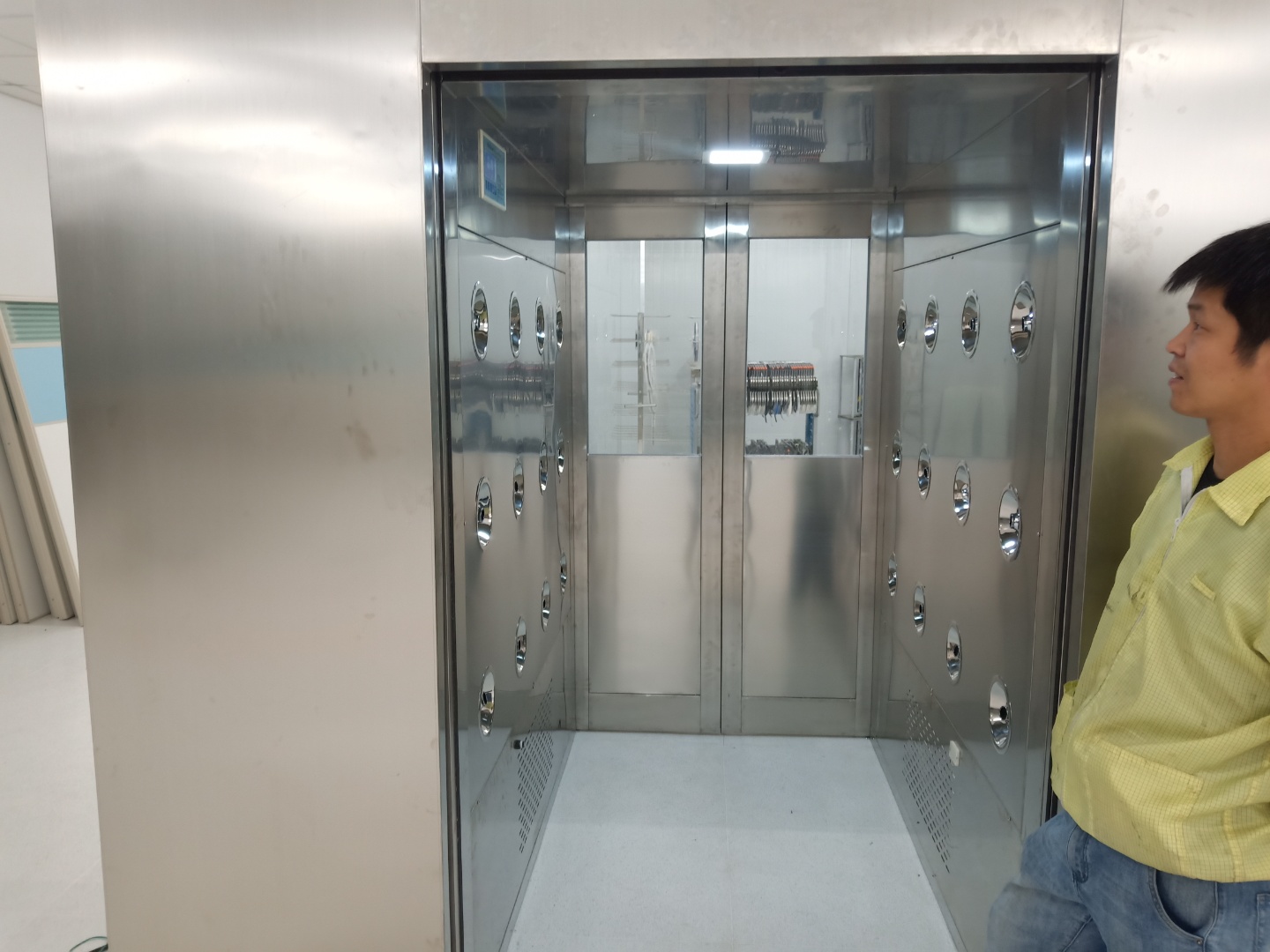 電子互鎖系統(tǒng)可防止風淋室門被同時打開,已導致潔凈室內外氣流貫穿。風淋時間可以在5秒至3分鐘之間自行設定,出廠基本設定為12秒。